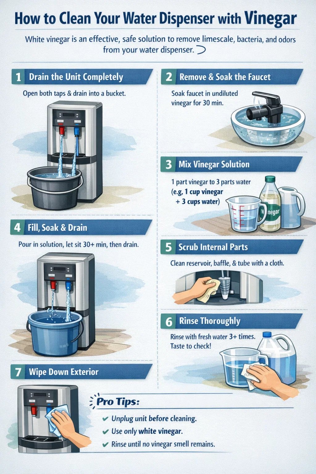 는se are the most common type and the most straightforward to clean with vinegar. The reservoir is directly accessible once the bottle is removed. The primary concern is the probe tube and baffle, which make direct contact with the water bottle neck and can harbor bacteria if the area around the bottle seat is not cleaned thoroughly. After draining, wipe the bottle seat area with a vinegar-soaked cloth and let it air dry before placing a new bottle.