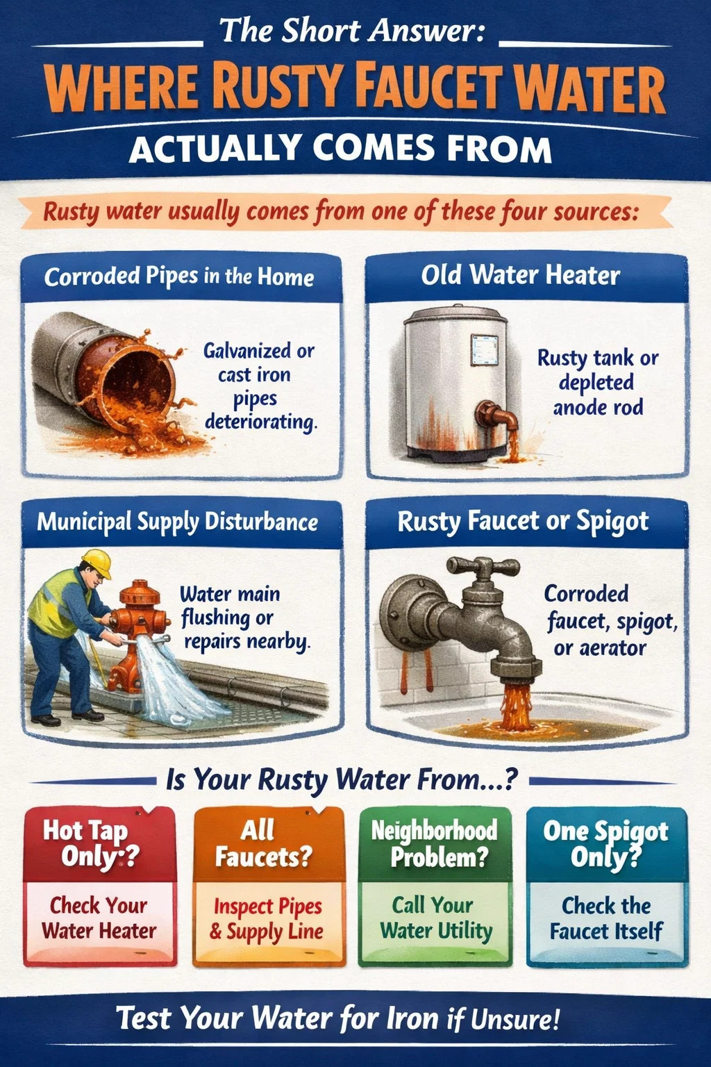 수도꼭지에서 나오는 녹물은 거의 항상 집 내부의 부식된 철 또는 강철 파이프, 열악한 온수기, 도시 공급 라인의 침전물 교란, 배송 지점의 산화된 꼭지 또는 고정 장치 등 네 가지 원인 중 하나로 인해 발생합니다. 여러분이 보는 주황색, 갈색 또는 붉은 색조는 산화철(녹)입니다. 이 녹은 파이프 내부에서 떨어져 나와 물줄기로 들어가거나 노후화된 인프라를 통과하면서 물에 직접 용해됩니다.