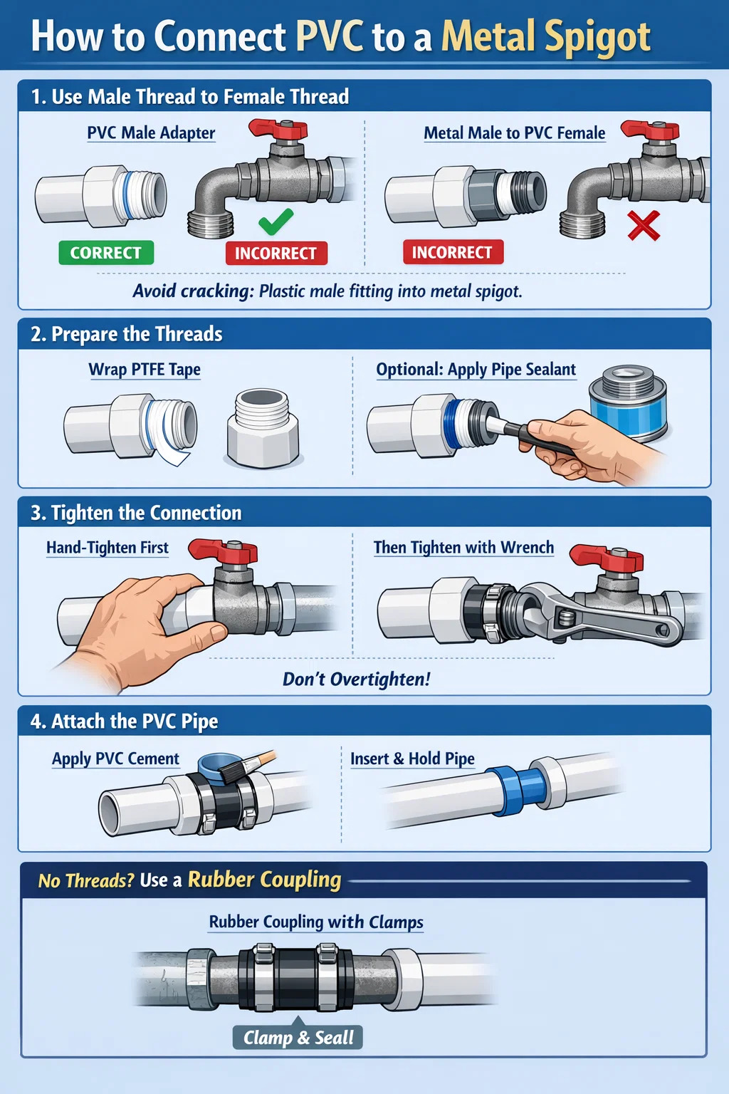 이유: 반대로 하면(금속 수나사를 PVC 암나사에 나사로 고정) 금속이 너무 단단해서 약간만 조여도 플라스틱 조인트가 쉽게 깨져 누출이 발생할 수 있습니다.