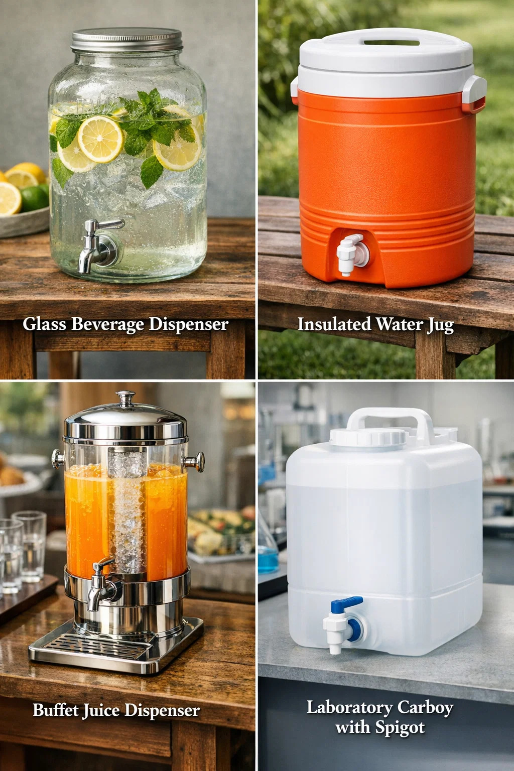 꼭지(수전/수도꼭지)가 있는 이러한 유형의 음료 용기는 모양, 재질, 사용되는 맥락에 따라 일상생활에서 다양한 이름을 가지고 있습니다.
