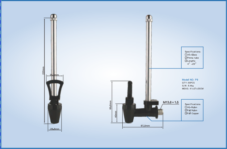 사이트 튜브, 마개, 와셔 및 너트는 모두 BPA 프리 소재로 제작되었습니다. 튜브의 외부 보호 장치는 경량 알루미늄으로 제작되었습니다. 그들은 전체 제품을 더 강하고 내구성 있는 구조로 만들어 마시기에 안전합니다.